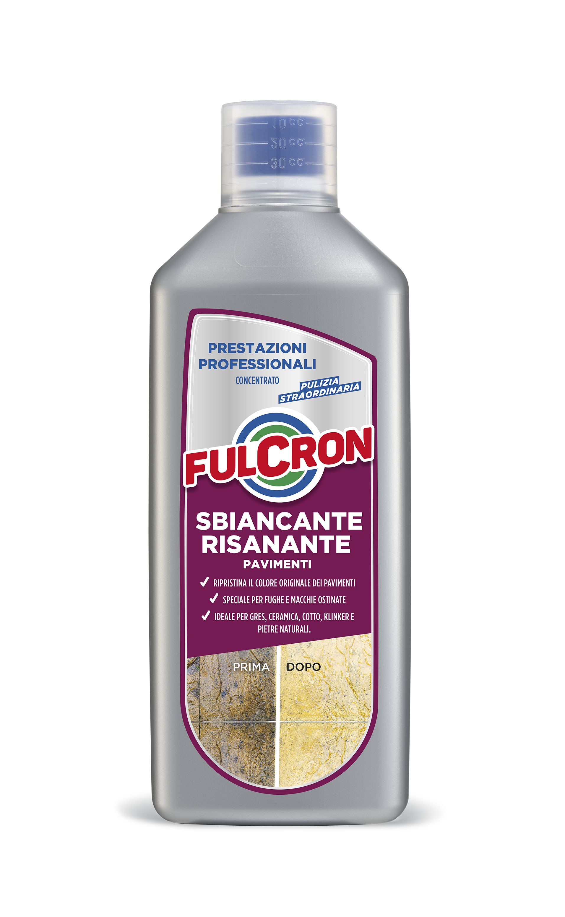 Detergente fortemente alcalino, privo di cloro, formulato per la pulizia di pavimenti in cotto, pietra, klinker, gres, cementi e graniglie. Svolge una speciale azione sbiancante e risanante: elimina grigiori, macchie e annerimenti da pavimenti e fughe, ripristinando l'aspetto naturale del pavimento. Rimuove ogni tipo di sporco (depositi di grasso, vecchi o errati trattamenti permanenti con cere polimeriche, etc.). Utilizzato almeno 1 volta all'anno, preserva il colore naturale delle fughe e dei pavimenti. Utile come neutralizzante in abbinamento a Fulcron Disincrostante Concentrato nelle operazioni di fine cantiere.